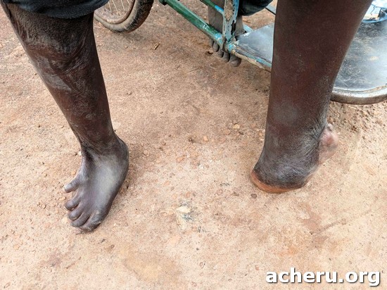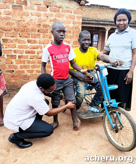 | On 30th October 2025 a team from Acheru travelled for a health outreach at Acimi in Oyam District with a stopover at Amuru Health Centre in Gulu District to meet a local partner pastor Francis who mobilises patients in the area. Francis is disabled and was previously assisted through Acheru to get a suitable tricycle. He brought a boy, Joshua, for assessment. Joshua suffered burns to his feet when he was only four days old. He is now 12 years old, suffering serious burns contractures which have never been treated, an all too common story. He has been referred to Acheru where suitable treatment can be arranged. |