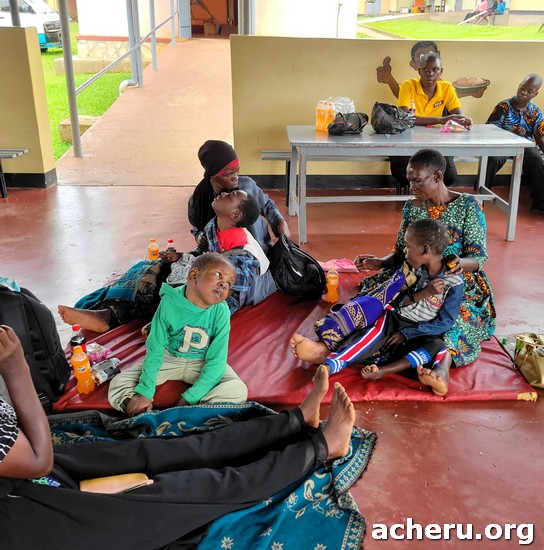 | Acheru works closely with COHERE, an organization which can sometimes provide assistive devices and learning materials for disabled children. The photo shows a few of the 20 children brought to Acheru by our Community Based Rehabilitation team to be assessed. Parents and carers came with the children for one day when there was health education, counselling and guidance. There will be follow up visits to their own homes to determine what help is required. Apart from any assistance given, this is an opportunity for carers and children who may previously have felt isolated to meet together with others in similar situations. |